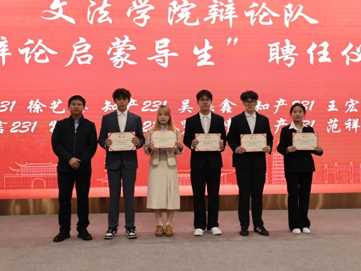 此外,活动现场举行了文法学院辩论队"辩论启蒙导生"与新任队长聘任仪式。石贤平院长为启蒙导生颁发聘书,陆雨辰律师为新任队长授聘,为辩论队建设注入新的活力。开幕式在与会领导、嘉宾的合影中圆满结束。