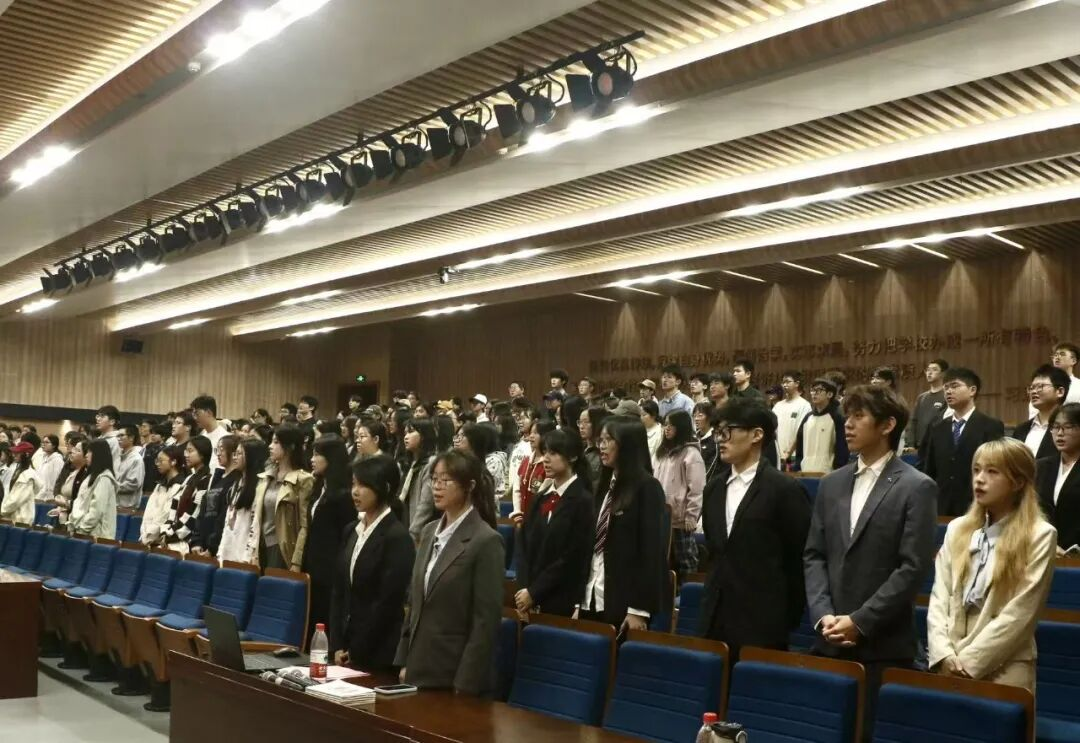开幕式中,石贤平致开幕辞,他结合新中国成立76周年和现行宪法颁布实施43周年的时代背景,阐述了法律文化节的重要意义,介绍了学院近年来在学科建设与人才培养方面取得的成果,并寄语文法学子传承红船旁的红色法治基因,做到"让法治成为青春底色、让廉洁成为青春品格、让担当成为青春力量"。最后,石院长宣布第二十三届法律文化节正式开幕。法学241班游思艺作为学生代表发言。她围绕青年使命,分享了"以法为盾守理想、以笔为剑书正义、以行为帆启新程"的深刻体悟,号召同学们践行校训院训,积极投身法治中国建设的伟大实践。