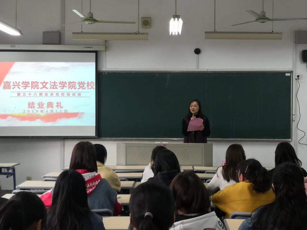 2019年4月11日下午,文法学院第三十八期业余党校培训班结业典礼在梁林一号楼举行,文法学院党委委员、学工办主任兼团委书记虞岚出席,典礼由学院党务秘书唐涛主持。