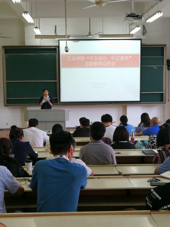 9月16日中午,文法学院党委在梁林校区1号楼222教室召开“不忘初心 牢记使命”主题教育部署动员会。会议由学院党委副书记虞岚主持。学院党委书记洪坚作动员部署讲话。