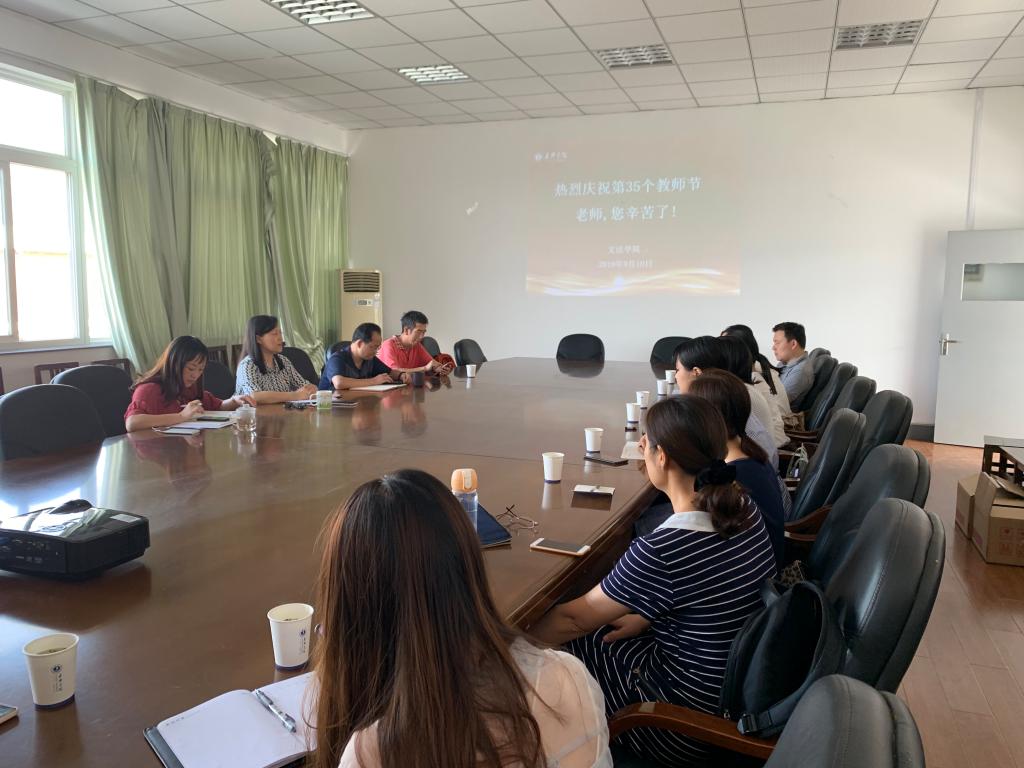 9月10日上午,在第35个教师节来临之际,文法学院召开庆祝第35个教师节座谈会。文法学院党委书记洪坚、文法学院副院长、工会主席步珏良、文法学院党委副书记虞岚及文法学院部分教师参加了座谈会。