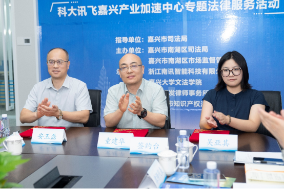 10月17日上午,嘉兴大学文法学院党委书记童建华受邀参加“AI助力 法护创新”科大讯飞嘉兴加速中心法律服务研讨会。本次研讨会由嘉兴市司法局指导,嘉兴市南湖区司法局、南湖区市场监督管理局主办,科大讯飞嘉兴产业加速中心、嘉兴大学文法学院、浙江开发律师事务所(嘉兴市知识产权法律服务中心)联合承办。嘉兴市司法局党委委员、副局长徐平,嘉兴大学文法学院党委书记、副院长童建华,南湖区司法局党委书记、局长朱国庆,建设街道党工委书记高建强,南湖区市场监督管理局副局长、党委委员钟屹等领导到场参加。