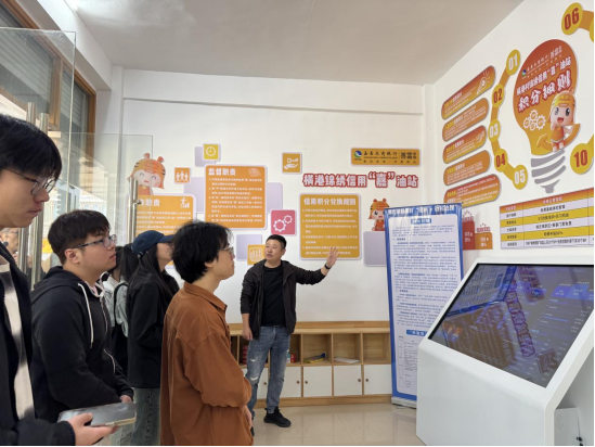 随后,师生们乘车前往姚庄镇横港村。走进村庄,整洁的村道、醒目的法治宣传橱窗、“善心堂”公共法律服务点以及环境卫生户比互评公示墙等设施处处彰显着浓厚的法治氛围。在村干部的带领下,同学们实地参观了“生态绿色加油站”和数字化积分应用平台,直观感受积分储存、查询、兑换全过程的可视化运作。